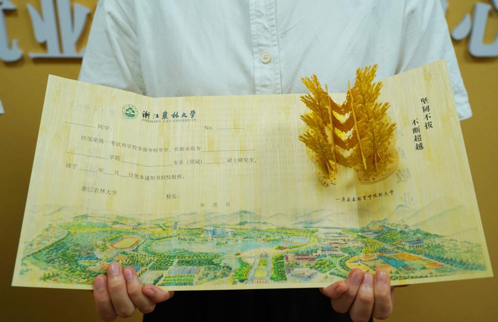 6月28日,浙江农林大学公布以刨切微薄竹为原料制作的2023版“最科技”“最低碳”录取通知书。今年,该校录取的2023级本科生,硕士、博士研究生将全部收到该版录取通知书。