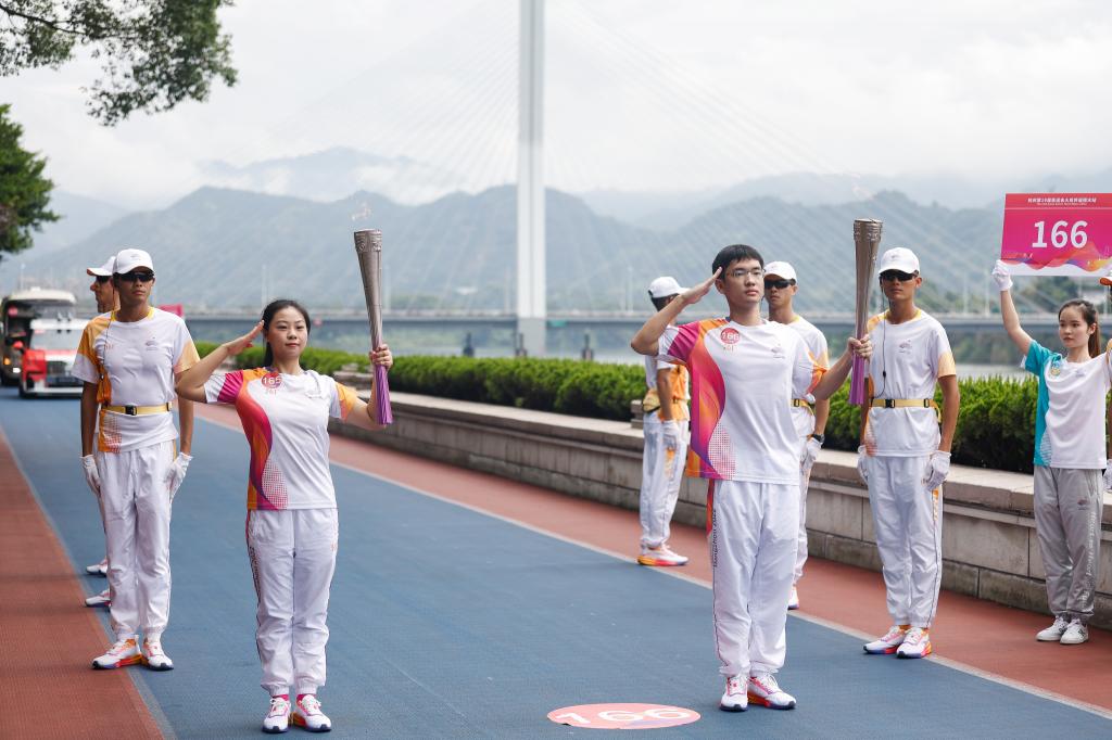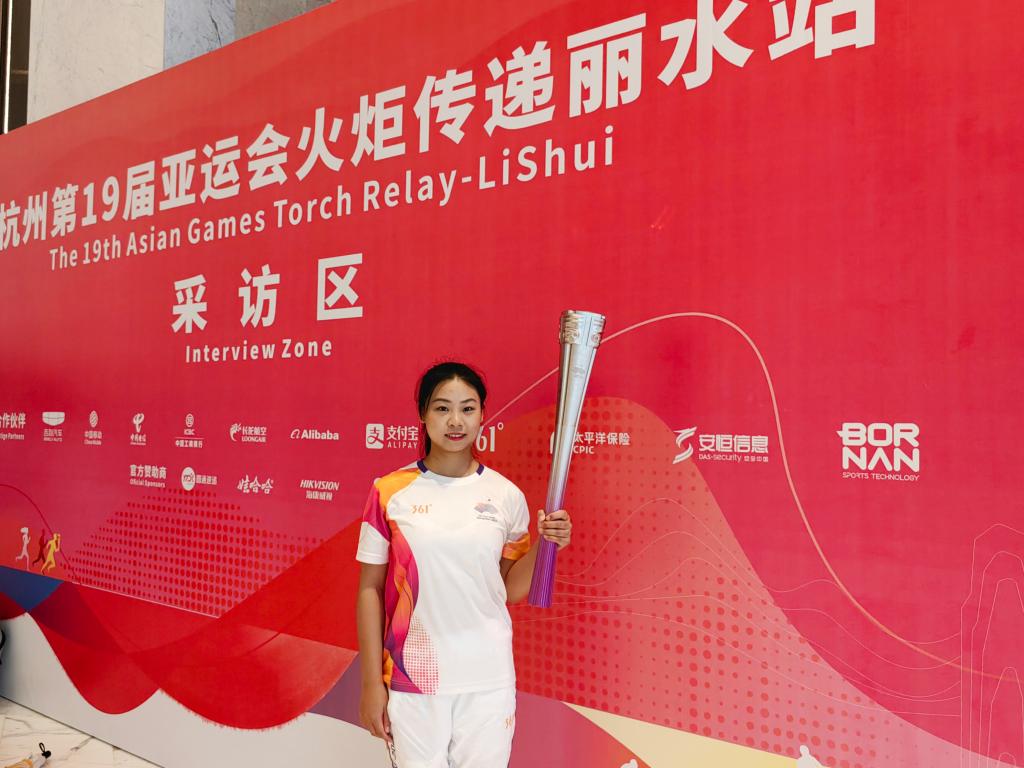 9月16日,杭州亚运会火炬传递仪式丽水站在浙江丽水举行。第165棒火炬手吴素青来自浙江农林大学。