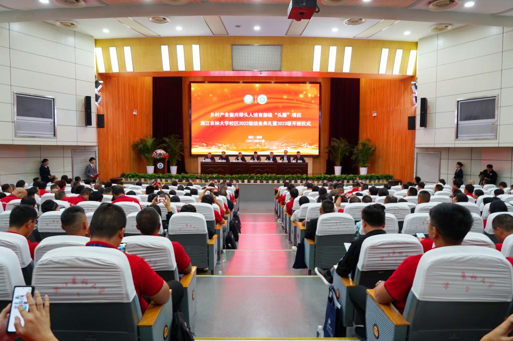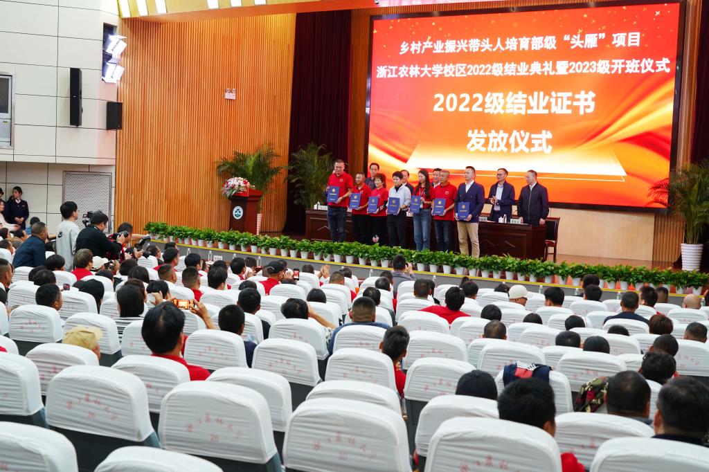 “专家学者,为我们解读政策、分享信息;创新课程,让我们开阔眼界、拓宽思路;基地考察,让我们了解产业、开拓思想……过去一年,我们收获巨大。今天的结业,是我们创业路上提升的第一步,今后我们将联合更多‘头雁’,互相帮助、资源交流,形成‘雁阵’,助力产业提升,优化产业结构,让‘头雁’的精神和‘头雁’的事业成为乡村产业振兴的核心力量。”10月21日,在浙江农林大学举行的乡村产业振兴带头人培育部级“头雁”项目2022级结业典礼暨2023级开班仪式上,2022级“头雁”项目学员、浙江省金华市婺城区双善文化艺术策划工作室负责人鲍胜充满信心地说。