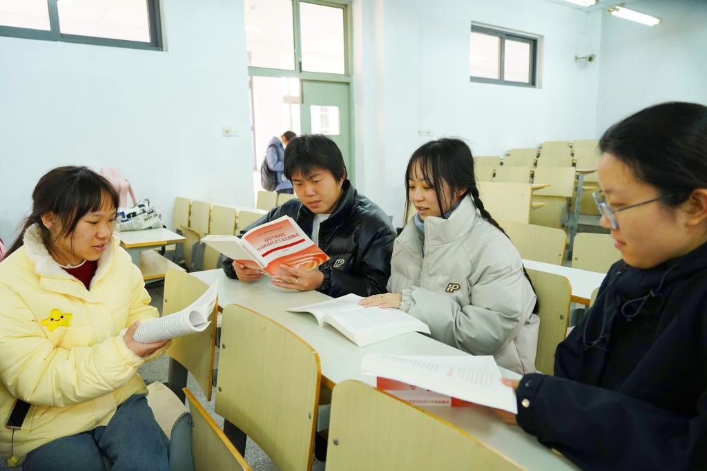 图③ 12月25日,浙江农林大学东湖校区教学楼里,几名学生在教室里交流学习《习近平新时代中国特色社会主义思想概论》的体会。陈胜伟 摄