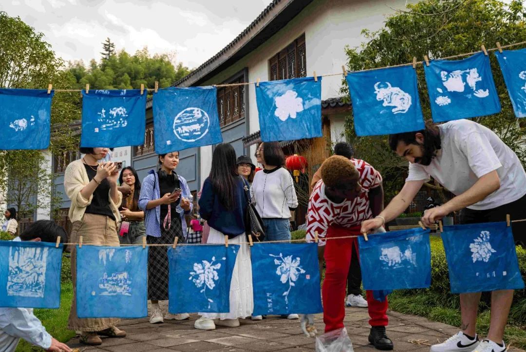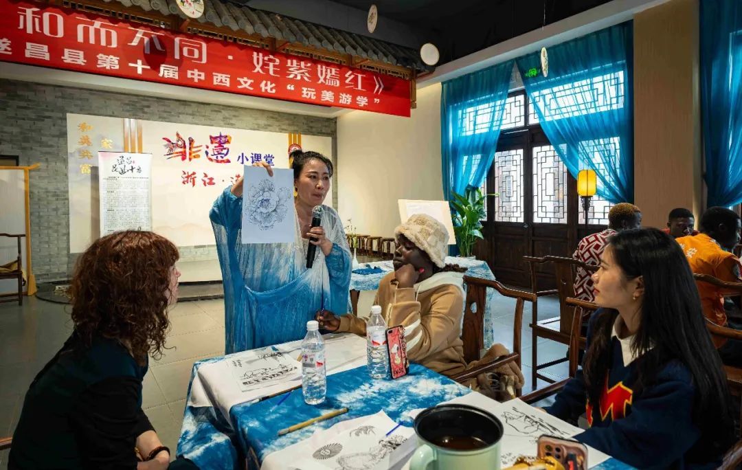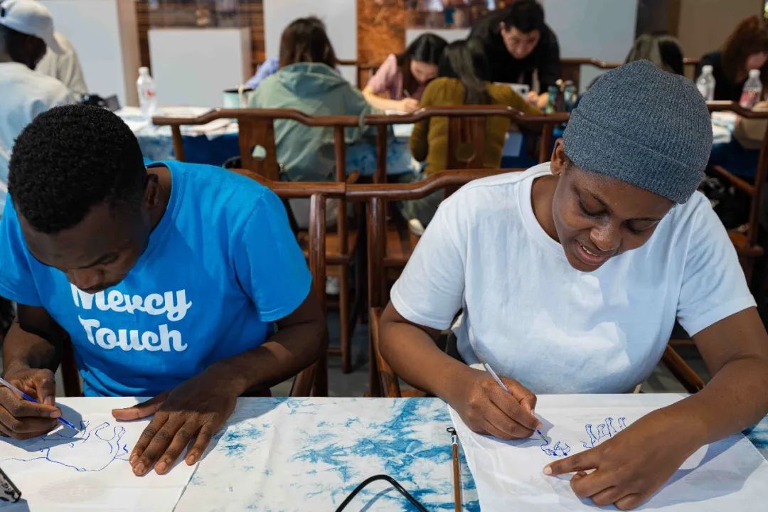 听完讲解后,留学生们很快掌握了扎染的基本方法和步骤,大家拿起工具,在白布上仔细绘制出精美的春牛图案。