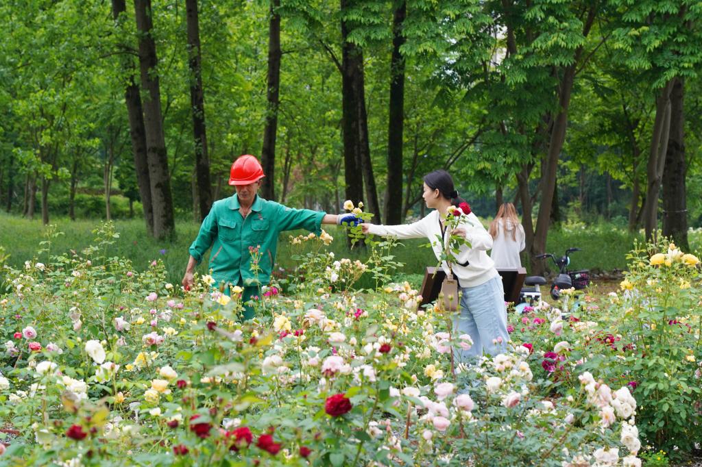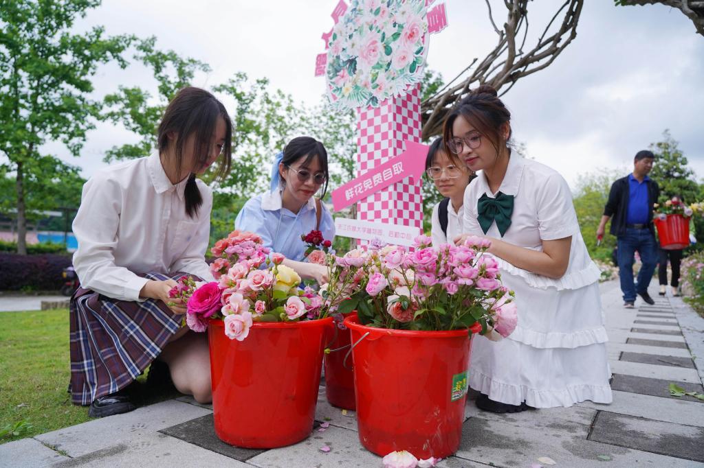 “平时每天上课路上,都会经过‘余香’园。园里的月季美美地盛开,给我们带来一天的好心情。园林工人将带有月季花苞的枝条赠送给师生,真是太棒了。这是校园里独有的一种浪漫。不仅美化校园,也能美化我们的寝室和心灵。”大二学生小周,挑选了几枝月季,准备做成插花养在寝室里。