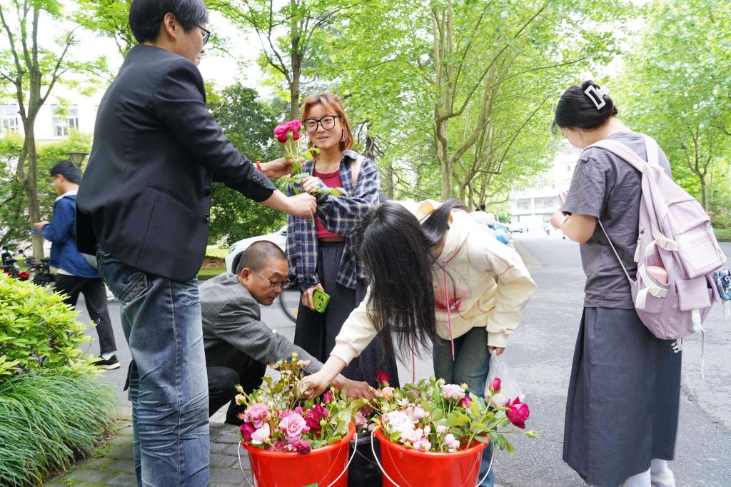 艺术学院的小徐有点“贪心”,一下子要了五枝月季。他说要分别送给几位老师。“给我上课的几位老师都非常不错。他们上课认真负责,专业学识让我敬佩,所以我想给他们每人送一支月季花,表达我对他们的尊敬。”小徐说,美丽就应该分享,这是一件非常有意思的事情。