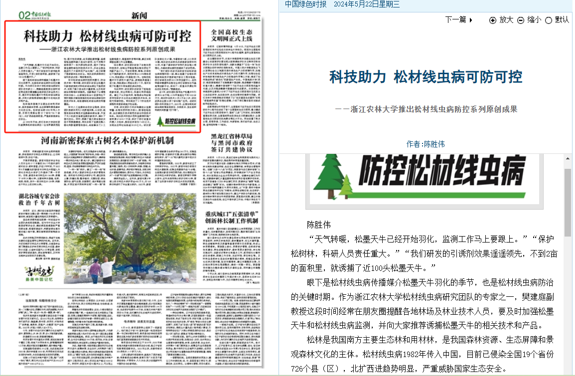 从1998年开始,浙江农林大学研究团队就聚焦松材线虫病这一全世界最具危险性、毁灭性的病害,在早期检测预警、遥感智能监测和媒介昆虫引诱剂、注干剂等方面取得了一系列原创性成果,提升了病虫害监测和绿色防控技术水平,并在全国各地进行了大面积的产业化推广,有力保障了国家森林生态安全。相关成果获得浙江省科技进步奖一等奖等奖项。