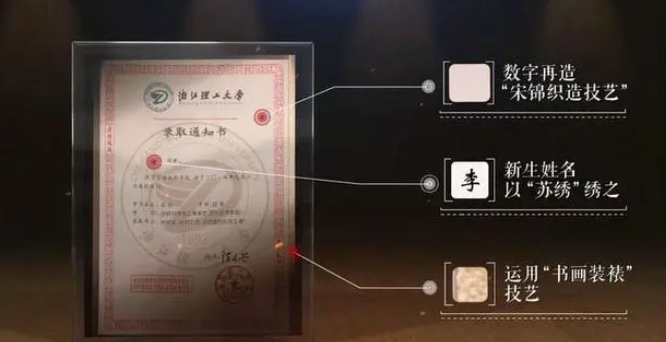 据悉,该通知书的设计灵感源自千年丝路文化和非物质文化遗产,采用宋锦作为底版。宋锦色泽华丽、组织结构独特,工艺复杂、质地坚柔,被赋予中国“锦绣之冠”。此次,浙理工通过数字技术赋能非遗工艺,使得宋锦织造达到精妙绝伦的艺术效果。