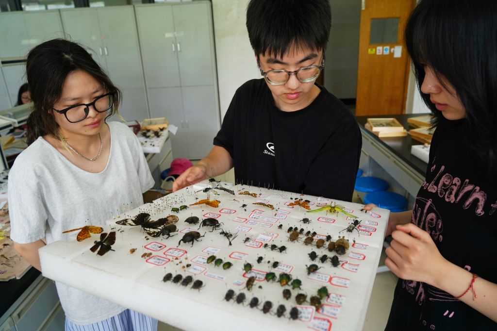 受梅雨季节的影响,今年捕捉昆虫难度比较大。应羽晗表示:“前几天,雨比较大,很多昆虫,比如鳞翅目,就出来活动得少了。我们就是随机应变。早上五六点钟爬起来去教学楼‘捡’虫子,这个时间段虫子不是很活跃,收获量也比较大。如果天气好点,我们就用网兜捕虫。晚上我们会进行灯诱。”