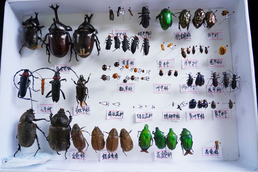 这两天,经过半个月时间的野外捕捉,浙江农林大学植物保护专业的学生,开始汇集在学校的标本制作实验室里,忙着将各种昆虫制作成标本,并根据昆虫所属的目、科、属、种分类摆放:独角仙、竹节虫、凤蝶、蜻蜓、金龟子、红袖蜡蝉……