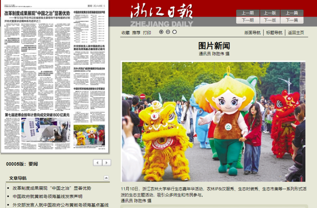 11月10日,浙江农林大学举行生态嘉年华活动,农林IP&汉服秀、生态时装秀、生态市集等一系列形式活泼的生态主题活动,吸引众多师生和市民参与。