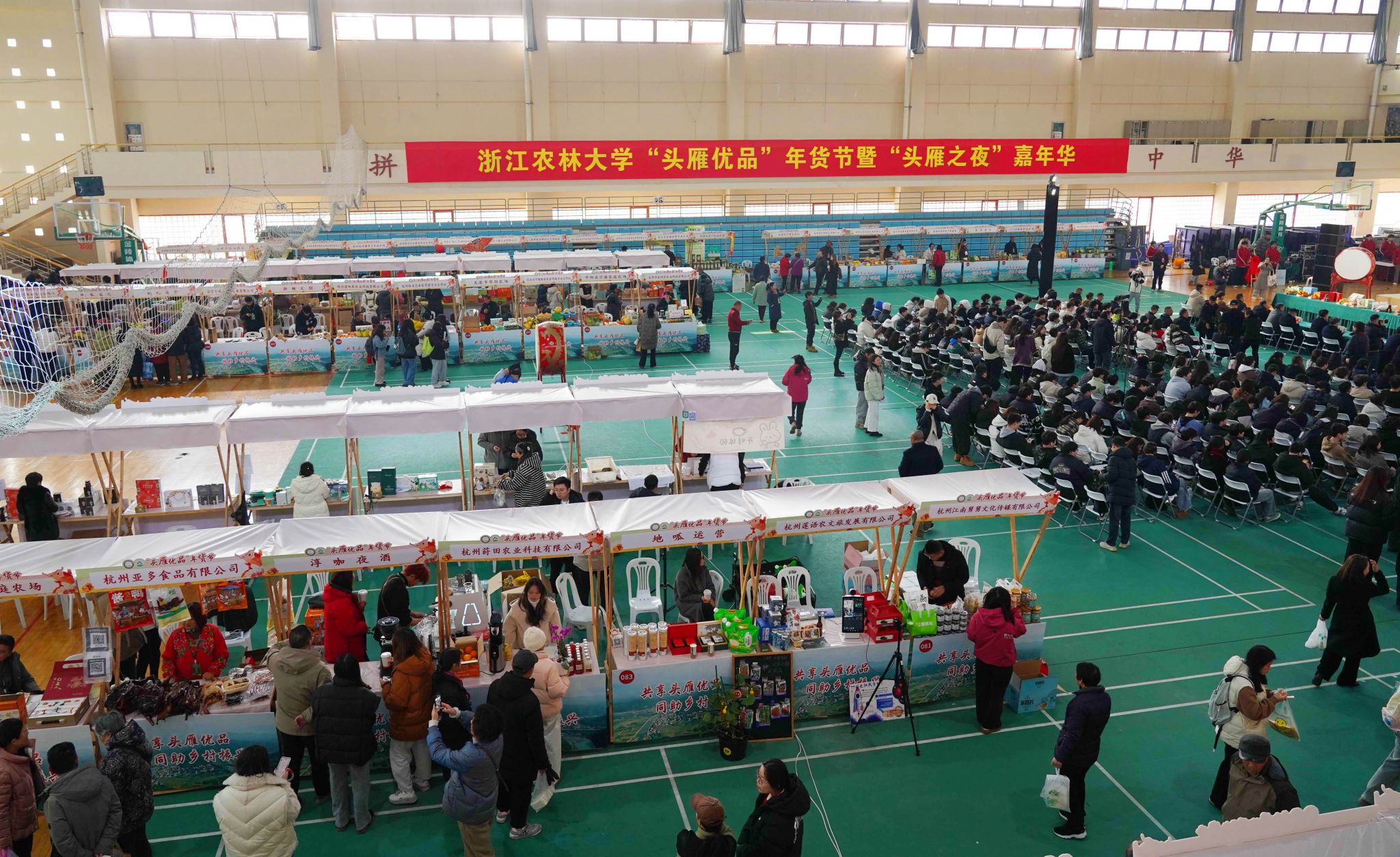 当天,由浙江农林大学继教学院、共富学院承办的“头雁优品”年货节暨“头雁之夜”嘉年华活动在该校东湖校区体育馆开幕。来自新疆、浙江、江西等地的128家“头雁”企业和“农创客”们带来了500多种特色农副产品,以及浙江农林大学教师团队自主研发的科技成果。现场展位分为美食区、科研产品区、农事体验区、蔬果区,综合区等五个区块,并提供现场快递服务,吸引了数以千计师生、市民前来买年货。