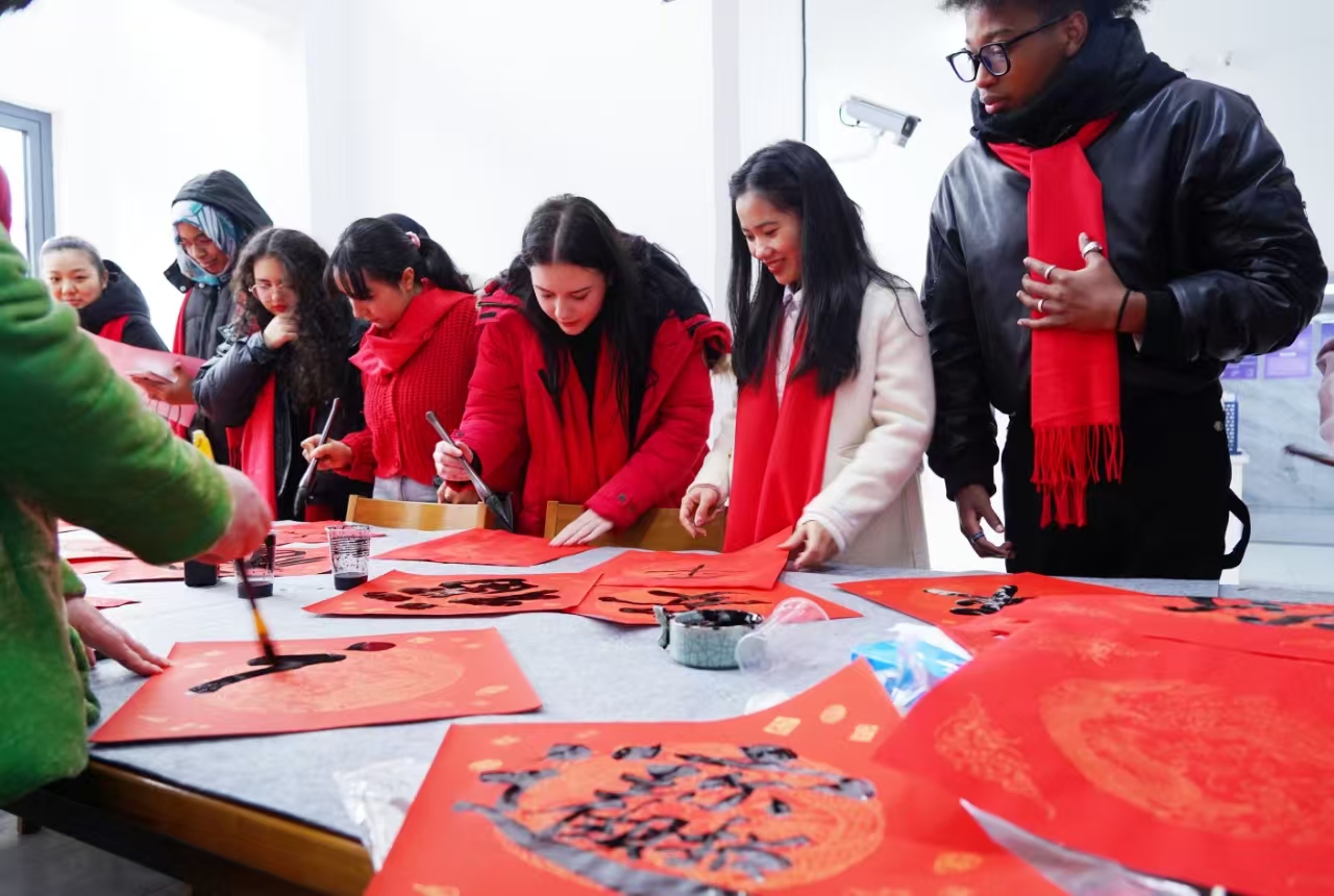 1月26日,浙江农林大学国际教育学院的留学生在老师指导下,一起写福字、挂灯笼、贴窗花,体验中国传统的年俗文化。浙江农林大学今年有来自50多个国家的300多名国际留学生留校过春节,学校为他们组织了丰富多彩的年俗活动。
