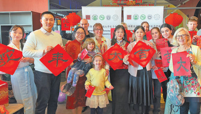 在塞尔维亚诺维萨德大学孔子学院近日举办的春节联欢活动上,当地学生展示书法作品。