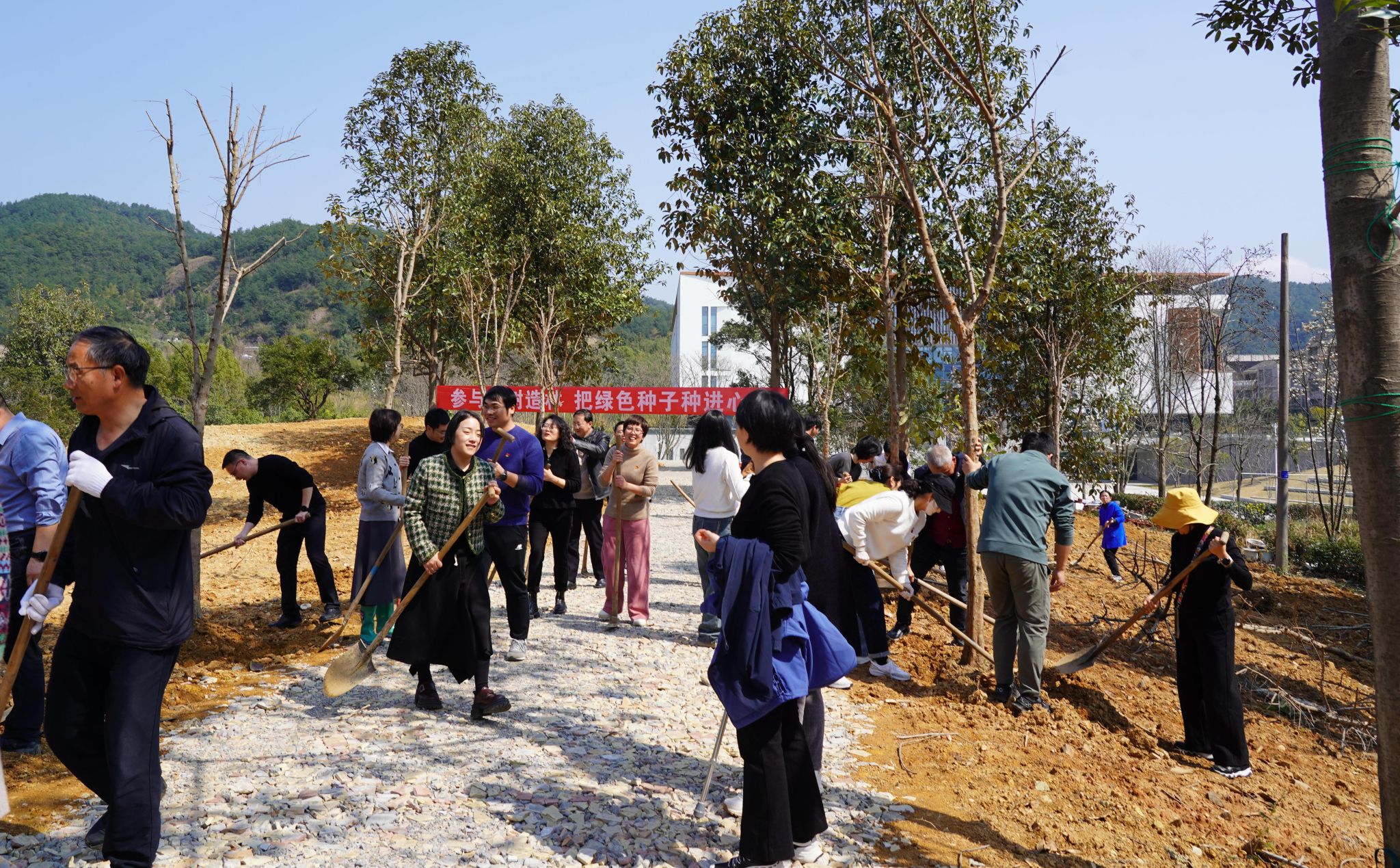 在植树现场,师生们分工合作、密切配合,手持锄头、铁锹等工具,挖坑、扶苗、铲土、浇水……大家将红豆树、浙江楠、柿树、细柄阿丁枫、三角枫、红豆杉等一批树苗种植在校园里。师生们在植树的同时,也进一步强化了生态文明意识,用实际行动植绿护绿,为美丽中国建设添砖加瓦。在接下来的一段时间,在该校3000多亩校园里,各种形式的植树活动、生态文明教育活动将如火如荼地开展。