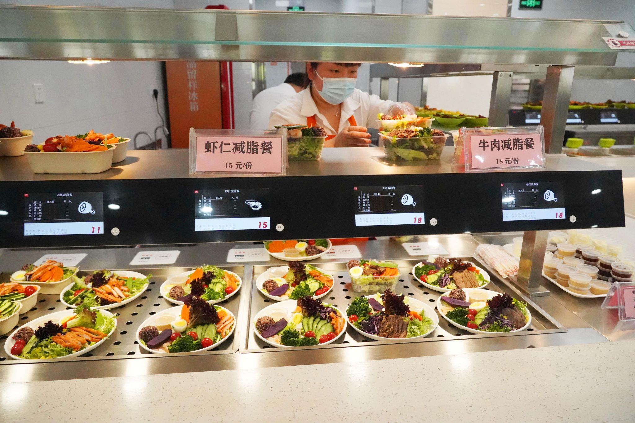 于是,经过精心设计和试制,学校食堂正式上线减脂餐:热量不超过500大卡,远低于普通套餐的热量。目前,减脂餐分为鸡排减脂餐、虾仁减脂餐、牛肉减脂餐三种口味。每份减脂餐都包括一份主食、一份荤菜、两份素菜和一份酱料。主食采用紫米饭或糙米饭,荤菜采用瘦肉或海鲜,素菜采用西兰花、生菜等时令蔬菜。所有的菜肴都采用少油少盐少糖的烹调方式,保证营养均衡的同时口感清爽。