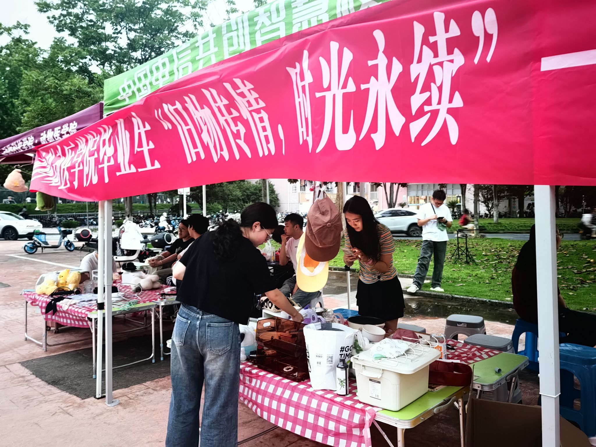 又到一年的毕业季。这两天,在浙江农林大学东湖食堂门口的广场上,该校动科动医学院的应届毕业生们,以寝室等为单位在低价出售或赠送各种二手生活学习用品:2元一把热水壶、3元一个插座、10元一个吹风机,更有一大批二手书籍、晾衣架、文件夹等无偿赠送。一个个摊位,吸引了不少低年级学生。