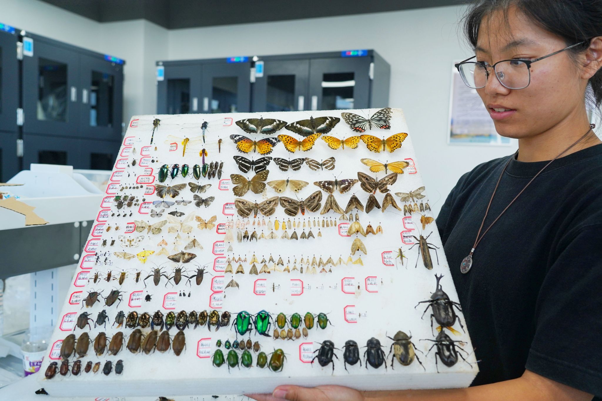 近日,经过半个月时间的野外采集,浙江农林大学植物保护专业2023级的72名同学,开始汇集在7号教学楼的标本制作实验室里,将各种昆虫制作成标本,并根据昆虫所属的目、科、属、种分类摆放:金龟子、独角仙、竹节虫、碧蛾蜡蝉、凤蝶、蜻蜓……