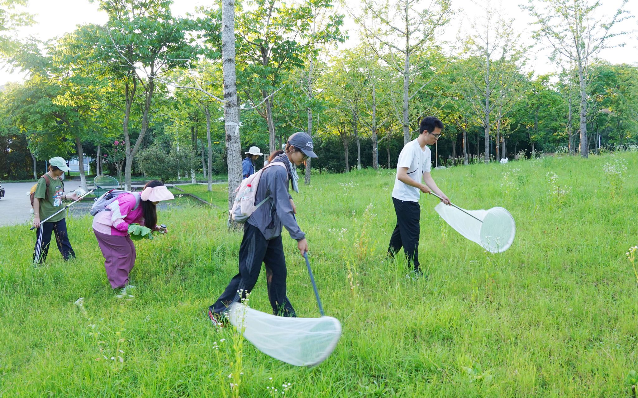 虽然学的是植物保护专业,也在课程中认识了很多昆虫,但要抓的昆虫种类这么多,心里难免会有点慌张。为了抓到形态各异、体型完整的昆虫,他们在老师的指导下,钻草丛、探高地,白天抓捕,晚上灯诱,连学院楼、教学楼附近的小草丛也不放过……