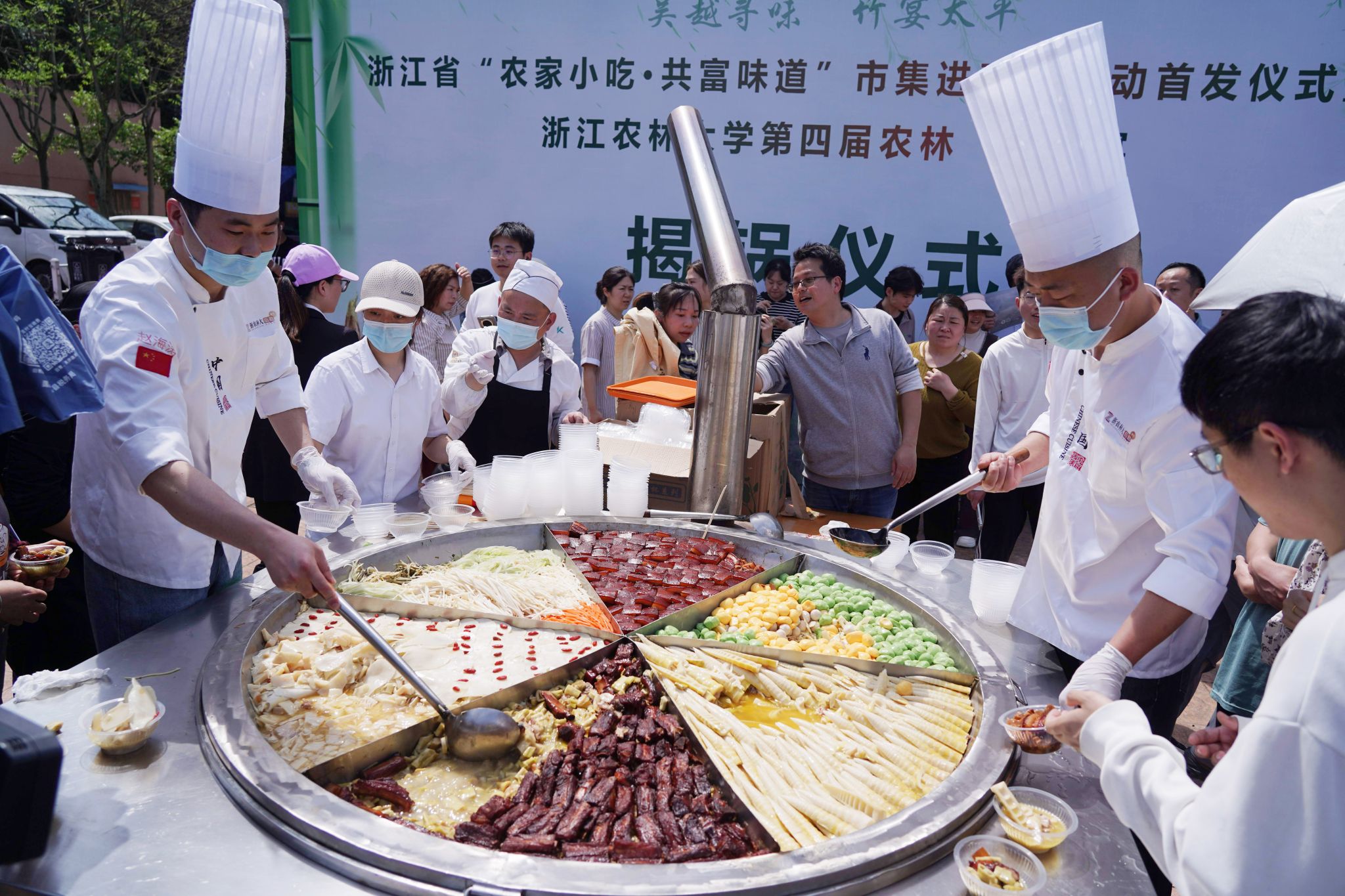 4月10日下午,浙江农林大学东湖食堂门口的广场上暖意涌动、热闹非凡。一口直径1.5米的“吴越六鼎太平锅”中,由该校竹子研究院改良培育的冬笋、春笋、雷笋、毛笋,搭配笋干、笋尖及杭州临安原生态竹笋食材烹制的6道特色笋菜同步起锅,鲜香四溢,吸引师生争相品尝来自田间竹海的“春天味道”,感受竹产业赋能乡村共富的生动实践。