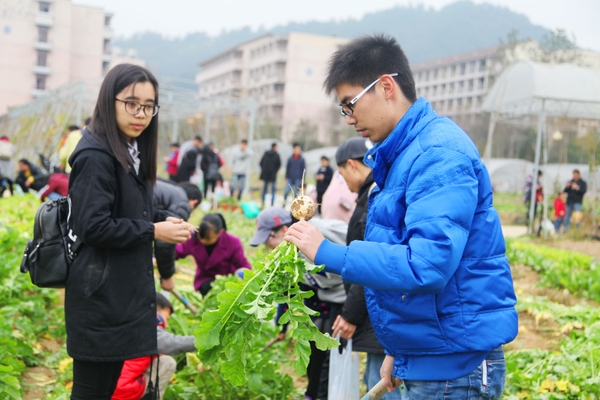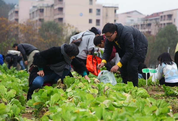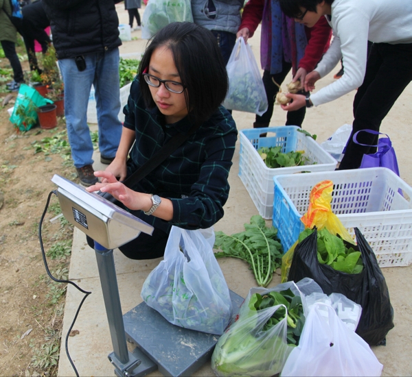 2016年12月12日,浙江临安,浙江农林大学部分教师在校园农作园里“抢购”学生种的蔬菜,有的老师甚至自己到菜地里采收蔬菜,并按照学生制定的价格购买。