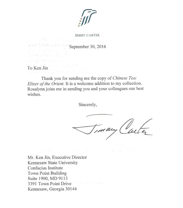 今年7月,制作方将电视纪录片的光盘赠送给美国前总统卡特。卡特是美国第39任总统,曾与邓小平会晤,对推进中美友好关系做出过重要贡献。收到纪录片的卡特总统亲自回信表示感谢,表示要将这部纪录片作为个人收藏。信的结尾,卡特总统向孔子学院表达了美好的祝愿。卡特的回信,进一步扩大了该部纪录片的影响力,推动了中国茶文化在美国的横纵并进,为汉语国际推广茶文化传播基地以及孔子学院探索文化传播新模式和推广中国文化树立信心。
