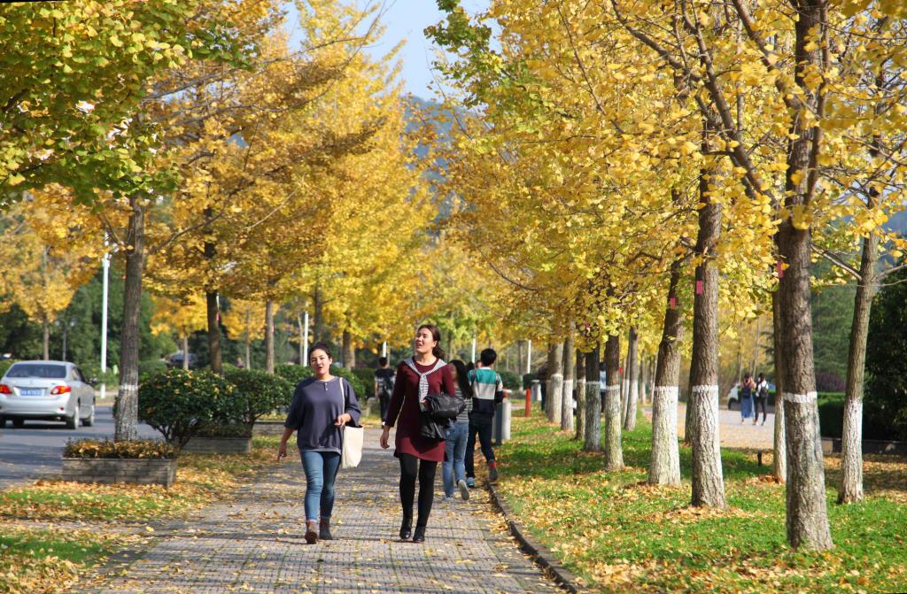 浙江农林大学的银杏林一片金黄,吸引了大批师生前来欣赏满,有的不时还在银杏树下拍照留念。