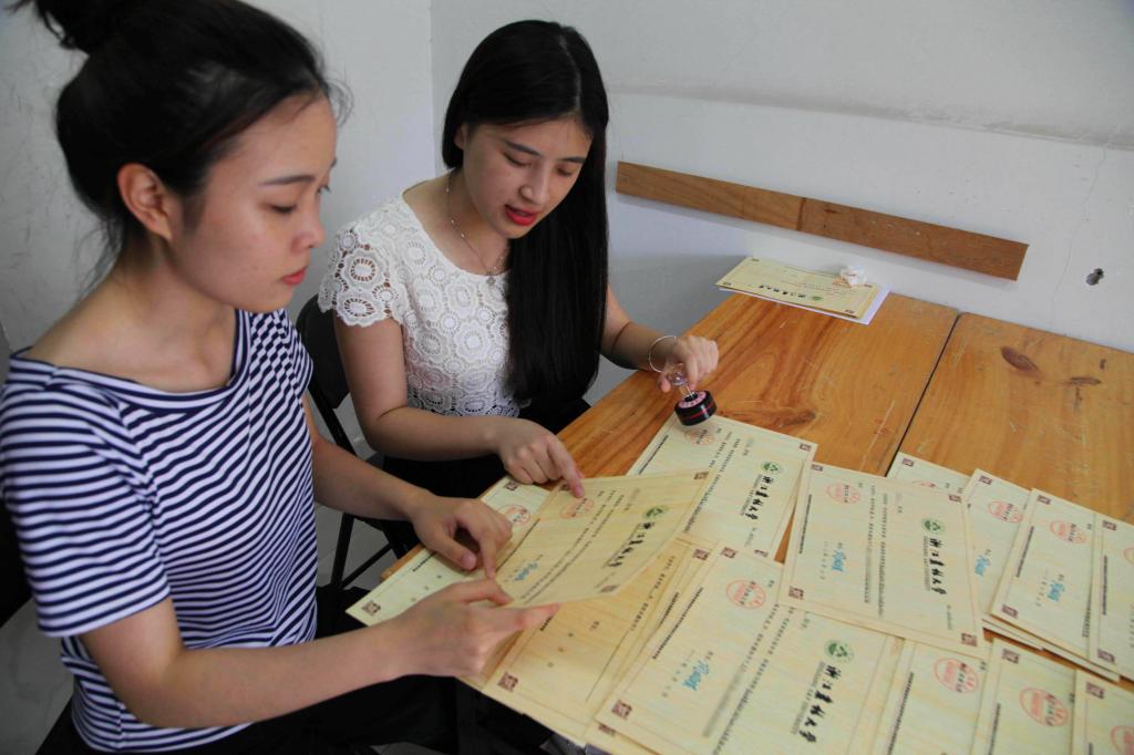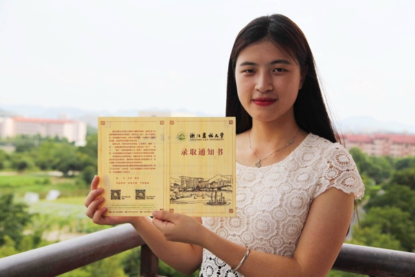2016年7月11日,杭州浙江农林大学的志愿者正在核对和展示用毛竹制作的2016级本科新生录取通知书。该录取通知书以毛竹为原材料,运用浙江农林大学自主研发的刨切微薄竹技术制作并印刷而成,相关技术曾获国家技术发明奖二等奖。供图/视觉中国 (来自:腾讯教育)