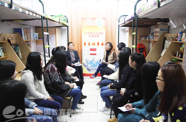 浙江农林大学法政学院的领导和师生代表在学生寝室召开“月末议事会”