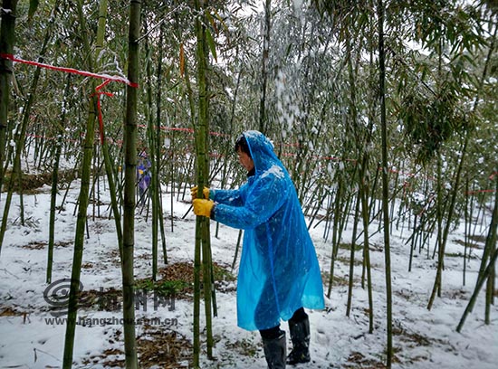 在组织科研人员做好研究基地应对暴风雪工作的同时,浙江农林大学竹类研究所的专家们也主动前往浙江省内外的竹子主要产区,和群众一起为竹林清除积雪,指导当地防雪救灾,将竹林的遭受雪灾的损失降到最低。