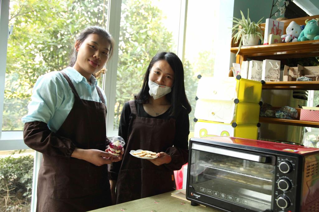 说是店铺,“学姐私房烘焙”其实只是浙江农林大学文化学院楼一楼走廊里的一个小空间,学院将走廊改造成学生的文化创意园,无偿提供给学生学习阅读、看书交流和展示创意产品。左晓红和彭佳丽烘焙蛋糕的操作间,就位于这条走廊中间约5平方米的空间里,是学院为支持她们烘焙蛋糕而免费提供的。