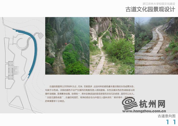 为保存历史遗迹,弘扬古道文化,学校决定在原古道遗址上恢复重建一段,其风格将呈现徽杭古道旧貌,以期更好的传承古道文化和崇学精神。”古道文化园设计师王欣教授介绍说,为了尽可能呈现古道文化原有的特点,文化园的很多设计多元素都强调传承,即使铺设古道所用的石材,也是从当地古道上搜寻来的老石板。