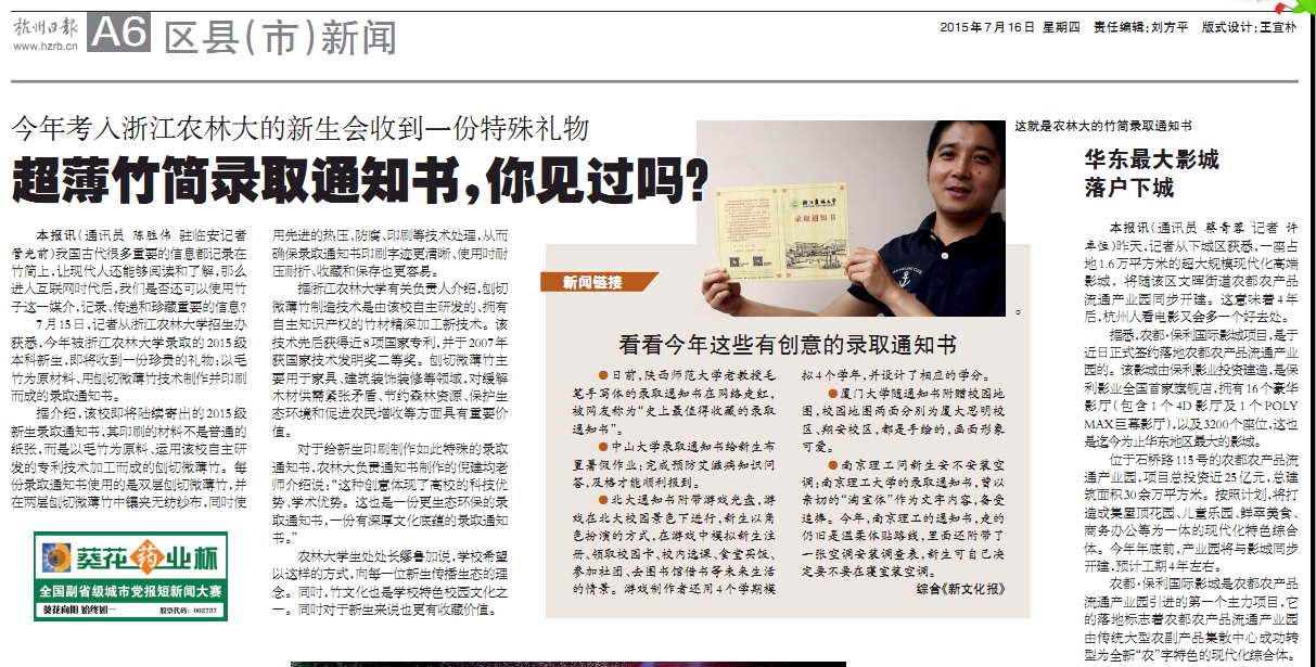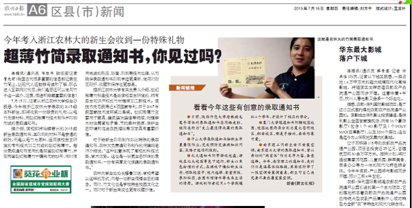 7月15日,记者从浙江农林大学招生办获悉,今年被浙江农林大学录取的2015级本科新生,即将收到一份珍贵的礼物:以毛竹为原材料、用刨切微薄竹技术制作并印刷而成的录取通知书。