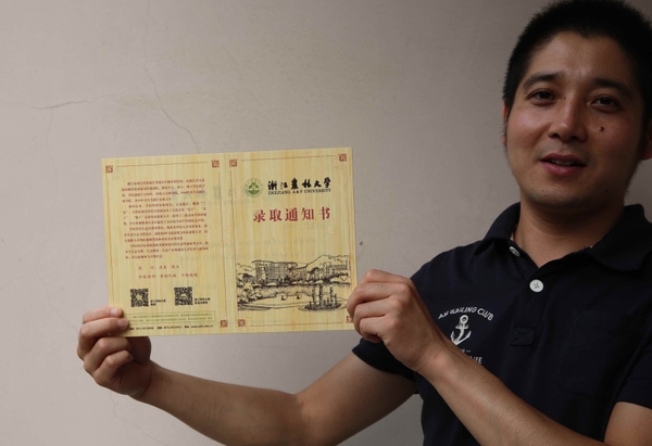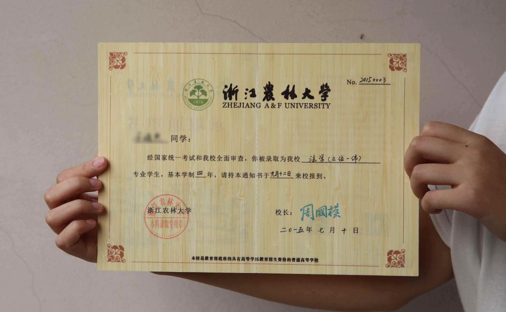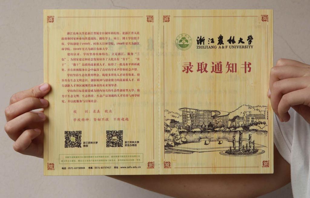 2015年7月15日,从浙江农林大学招生办获悉,今年被浙江农林大学录取的2015级本科新生,即将收到一份珍贵的礼物:全球独一无二,以毛竹为原材料、用刨切微薄竹技术制作并印刷而成的录取通知书。
