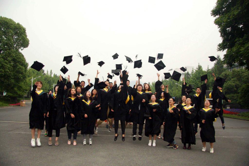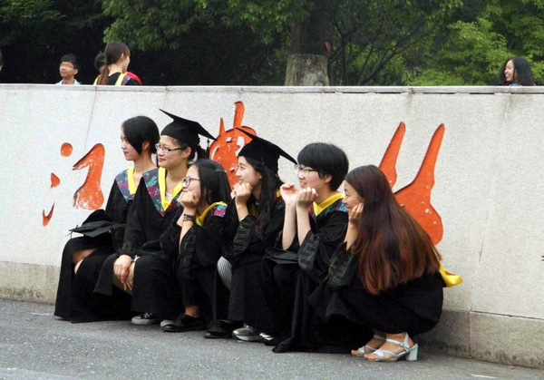 日前,浙江农林大学的应届毕业生身穿学士服,在校门口拍摄各种纪念照片庆祝毕业。