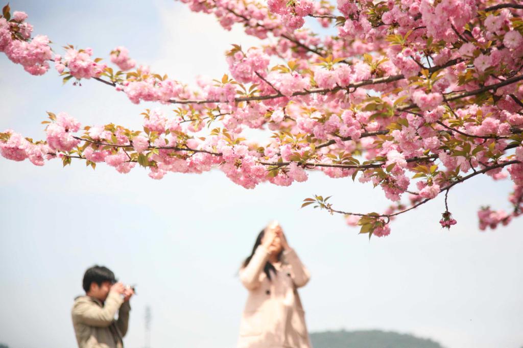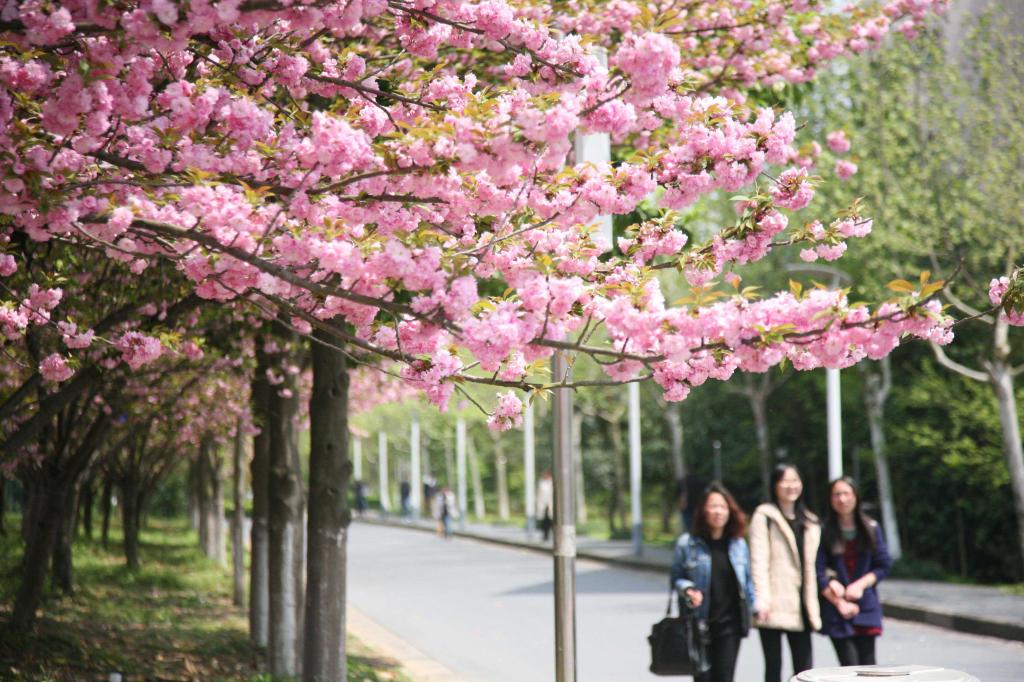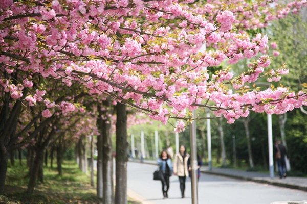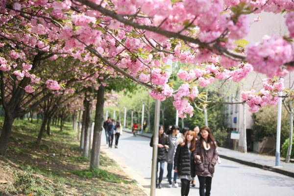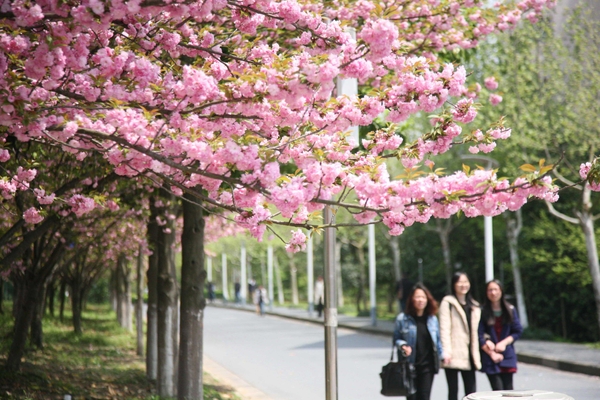 4月8日,浙江农林大学校园里,学生们从樱花树下走过,有的还举起手机拍摄满树的樱花。据介绍,浙江农林大学校园里现有植物种类近3000,其中春天开花的各色植物不下百种,尤其是随着满园樱花的盛开,整个校园已经成为花的海洋。 中新社发 陈胜伟 摄