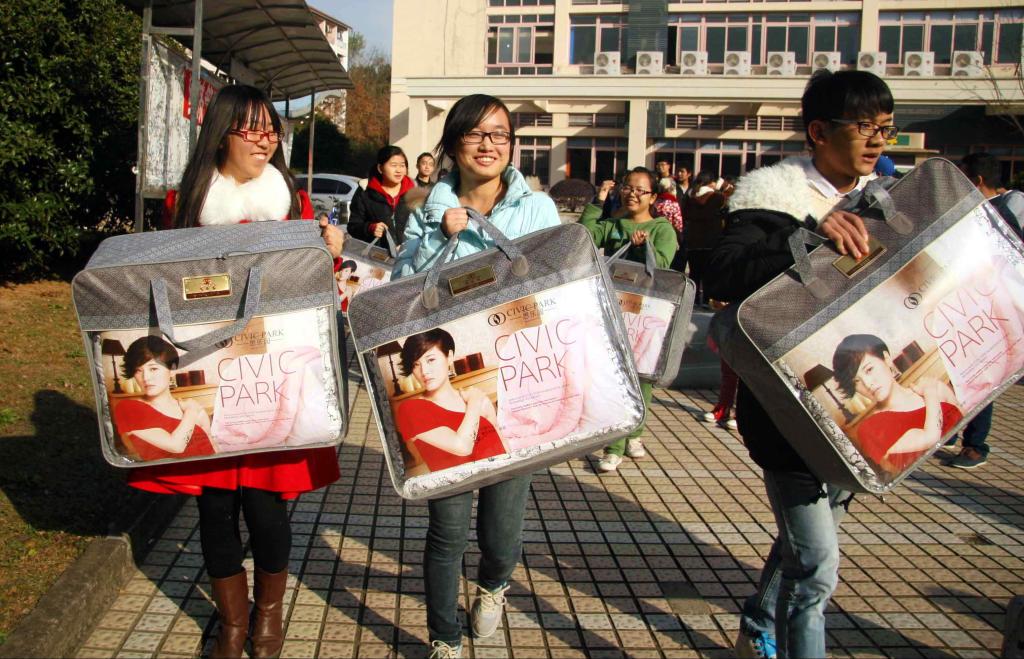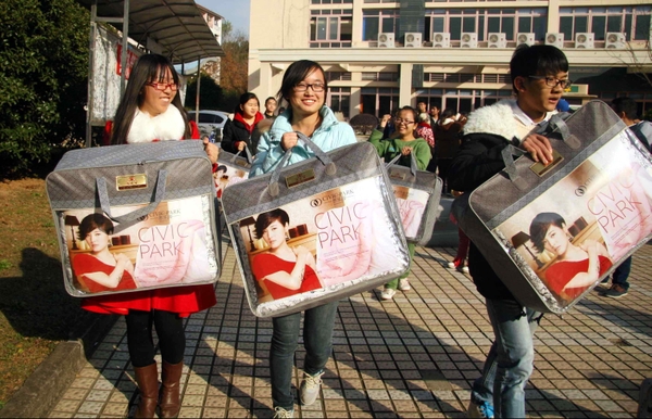 浙江农林大学贫困生比例一直较高,为帮助贫困生抵御严寒、安心学习,该校各个学院纷纷开展送温暖活动,为贫困生送上保暖用品。图为近日,浙江农林大学经济管理学院的近一百名贫困生,开心地领到了学校发放的爱心被子。
