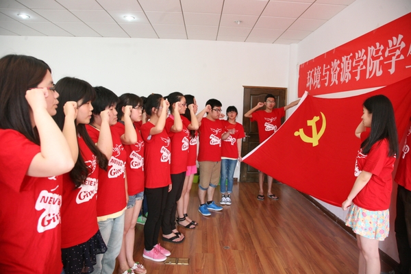 2013年6月30日,浙江农林大学环境与资源学院组织新发展的大学生党员进行入党宣誓仪式,老党员还为新党员佩戴上党徽。 当天,浙江农林大学各个学院纷纷开展新党员宣誓仪式,希望通过对大学生新党员进行的庄严、生动的党的观念教育,让大学生党员能发挥党员的先锋模范作用,为实现“中国梦”注入正能量。