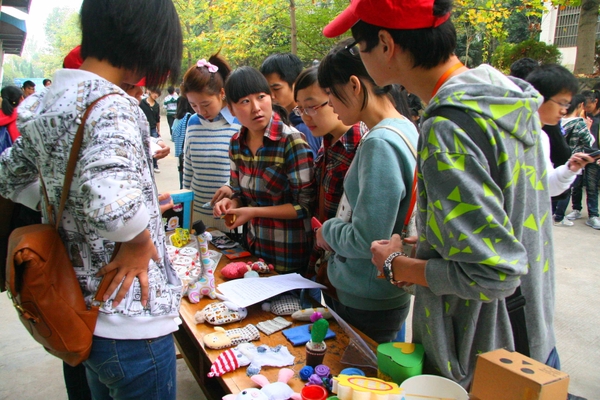10月26日,浙江农林大学的大学生志愿者正在介绍用可乐瓶、旧布料等制成的各种精美装饰品,学生们只要积极捐助旧书、饮料瓶等废品,就可以免费获得一件这样的“生态”艺术品。