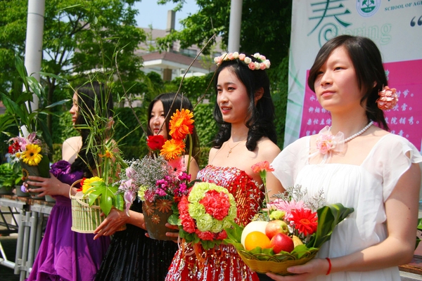 5月5日是立夏节气,在浙江农林大学农学院举办的农艺博览会上,由学生扮演的“百花仙子”,通过表演插花艺术、展示时令水果花卉等形式迎接“立夏”的到来。