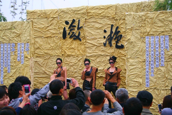 在春风拂面的白堤上,来自浙江农林大学的40多名学生模特身着由该校服装设计专业学生设计的150套服装,依次登台而“秀”。这些服装全部用棉、麻、丝、竹纤维等天然材料制作而成,向公众传达生态服装的理念。近两天,由杭州市人民政府和浙江农林大学共同组织的全民饮茶日系列活动在西子湖畔陆续举行。农林大的学子为游客精心编排出演了由著名作家、农林大教授王旭烽编剧、导演的《六羡歌》、《中国茶谣》等舞台剧,还献上了意境清雅的茶艺表演和青春热力的服装秀。