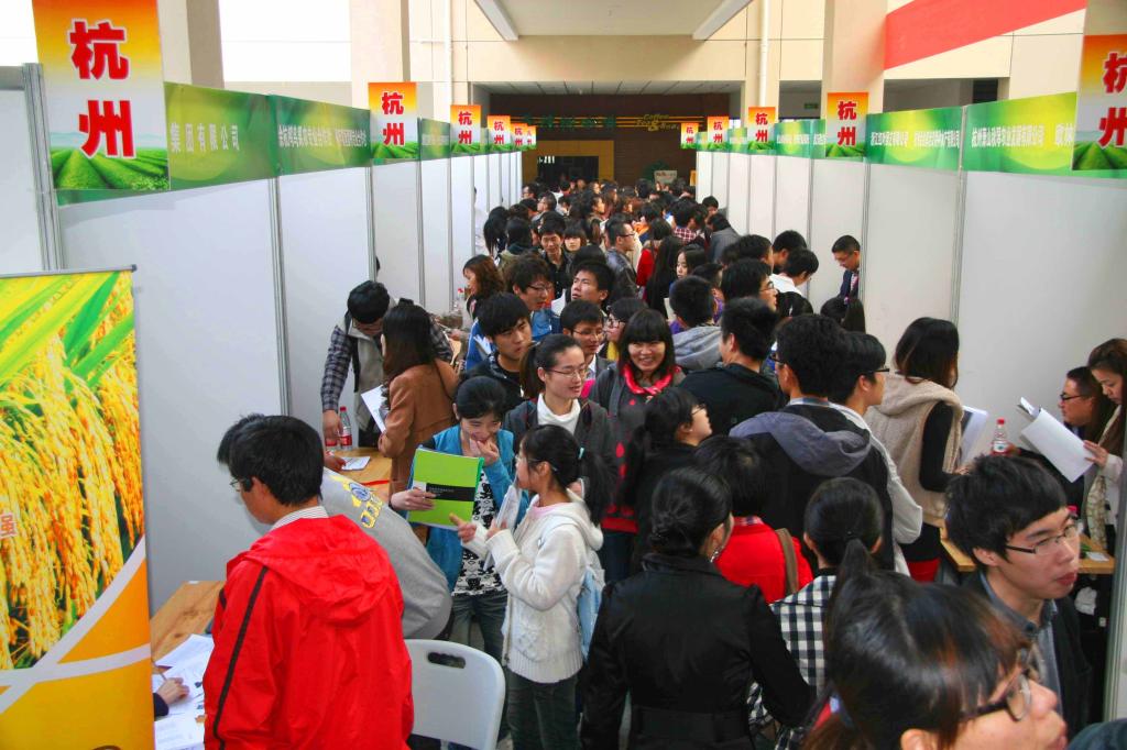这天,前来招聘的很多单位,本身就是大学生们创建或由大学生担任骨干的的农业企业。在嘉兴农业企业招聘会专区,嘉兴碧云花园有限公司的周梅,成了前来应聘的师弟师妹们的偶像。这位毕业于农林大学的大学生,凭借过硬的园林技术,不到半年时间成功担任项目专员职位,从事公司的科研工作,现在又代表公司前来招聘师弟师妹;今年7月刚刚从浙江农林大学动物科学专业毕业的姜九龙,现在已经成为浙江国茂饲料有限公司的招聘人员,同样是回学校来招师弟师妹的。