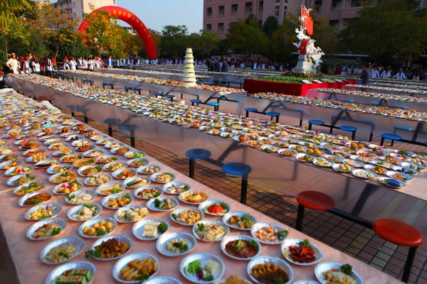 昨日下午,浙江农林大学食堂的近200位厨师,将刚完成的近10000道精美的菜肴、点心、水果拼盘等,摆放在校园里接受全校师生的参观、品尝和投票评选。其中有600多道不同的美食,原料全部为竹笋。