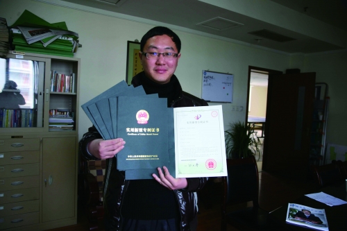 他,就是被同学们称为“专利哥”的张业放,现为浙江农林大学机械设计专业072班的学生。有细心的同学帮他算了算,从大二开始申请专利算起,他几乎每周都能够获得一项专利。