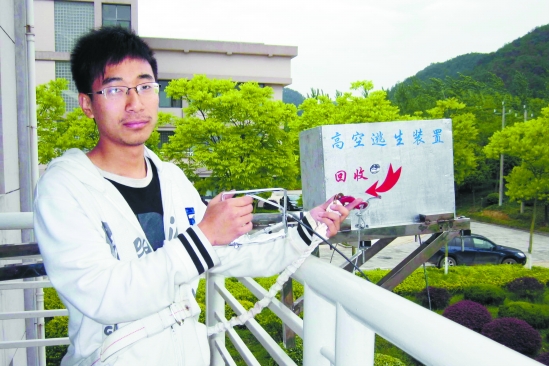 “学生设计的装置有两个优点,一是可以使用刹车绳来控制速度,保证人员在到达地面时是一个安全速度。二是成本低,全套只要几百元就可以,容易普及,就像空调外机一样装在阳台上就可以了。”浙江农林大学范兴铎老师认为,这套装置最关键的是所有操作都可一个人独立完成。
