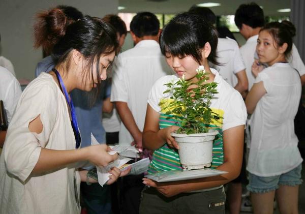 浙江农林大学理学院在报到处摆放了数百盆植物,每一名新生完成报到手续后,都可以领取一盆植物。据介绍,这些植物都是由浙江农林大学高年级学生准备的,现在作为礼物送给前来报到的新生们,一方面是希望能够从开学第一天,就能树立学校积极倡导的生态环保意识,在生活学习中树立低碳的理念;另一方面这也是一份特殊的作业,希望学生们能够在大学期间养好植物,在学习之余修身养性。图为一名新生刚领取一盆绿色植物。