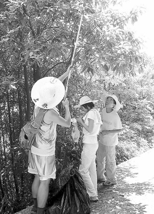 从7月27日开始,来自浙江林学院园林专业的学生,就在谢云等专业老师的指导下,背着背包,带着高枝剪、标签、蛇皮袋、相机等,深入到青田以及周边几个县市的石门洞、天师岩、师姑湖、龙湾潭等大山深处、大湖边上,寻找野生观赏植物。在山上,大学生们戴着草帽,拿着工具,一边进行野生花卉的标本采集,一边鉴定、记录。虽然天气闷热,蚊虫繁多,但先后发现的多种野生花卉,也不断激励着大家。大学生们的腰酸腿疼都被发现一朵美丽的野花、一丛可供观赏的野生植物所带来的喜悦替代了。