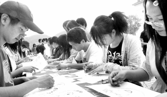 4月21日,志愿者在组织学生和市民描绘心目中的地球、写下对地球母亲的祝福。当日,100多名浙江林学院经济管理学院的大学生志愿者,在学校周围组织开展“善待地球”系列宣传活动,吸引了2000多名学生和市民的参与。