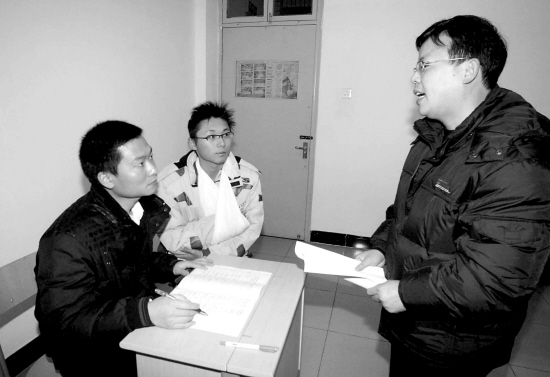 参加考试的考生名叫叶鹏程,是浙江林学院天目学院生物环境066班的学生。去年12月22日在上体育课时他不幸摔伤,造成右手严重骨折至今没有康复,更不能握笔写作业。正当他为自己不能正常参加期末考试而着急的时候,学院领导专门进行了讨论决定:除了少数需要大量计算或者书写的课程叶鹏程可以缓考外,其他课程他都可以正常参加。为了确保叶鹏程顺利完成考试,学院专门为他布置了临时考场,选派专门的老师来执笔。
