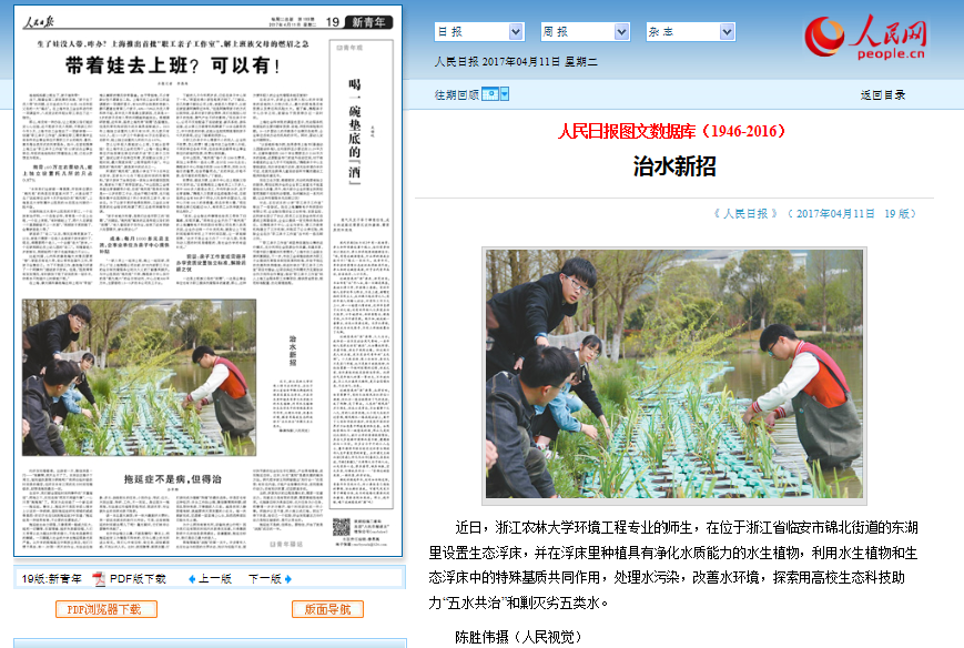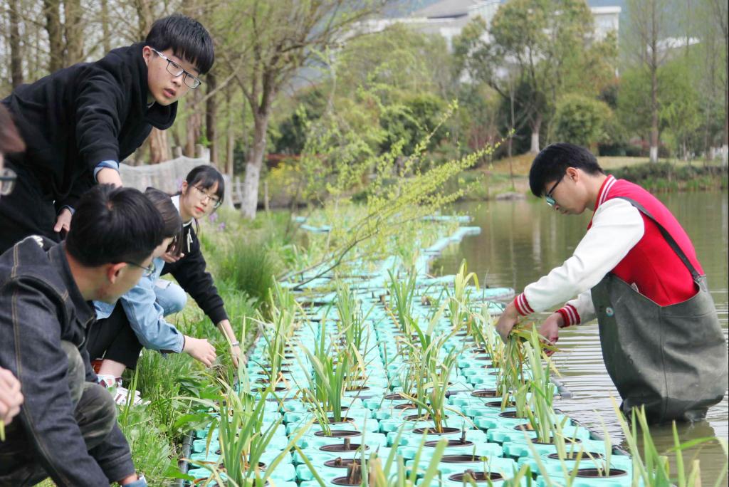 近日,浙江农林大学环境工程专业的师生,在位于浙江省临安市锦北街道的东湖里设置生态浮床,并在浮床里种植具有净化水质能力的水生植物,利用水生植物和生态浮床中的特殊基质共同作用,处理水污染,改善水环境,探索用高校生态科技助力“五水共治”和剿灭劣V类水。