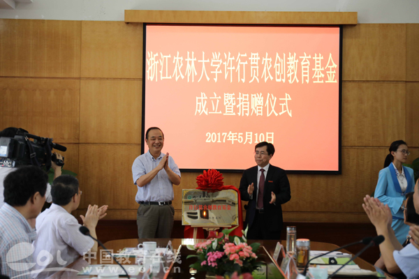 当天,一场简朴而隆重的“许行贯农创教育基金”成立暨捐赠仪式在浙江农林大学举行。浙江省原常务副省长许行贯同志,为更好地引导青年大学生服务‘三农’,在家人的支持下捐出平生个人积蓄100万元人民币,在浙江农林大学成立“许行贯农创教育基金”,用于资助和鼓励该校大学生投身现代农业领域的就业创业。