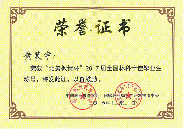 国家级荣誉2项、省级荣誉6项、校级荣誉30余项……细数荣誉,黄笑宇在大学四年时间里,始终微笑着取得了一项有一项成绩。优秀的学生往往各个方面都优秀,如今她早已加入了中共党员,毕业前夕还获得2017届全国林科十佳毕业生。她的努力让同学心疼,她的优秀让大家羡慕。