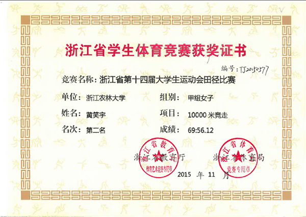 让很多同学想不到的是,成绩好、学生工作能力强的黄笑宇,还是一个体育健将和文艺骨干。大学生期间,她曾获浙江省第十四届大学生运动会女子10000米竞走第二名;浙江省第十四届大学生运动会女子5000米竞走第三名;中国高等农业院校第八届大学生运动会女子3000米竞走第四名,是浙江农林大学女子竞走项目三项校记录。此外,她还是校礼仪模特队、校主持人组成员,当过电视台外景主持人,主持过多场大型活动、晚会,就连参加学校演讲比赛,也能轻松摘取一等奖。当然,付出了多少艰辛,只有她自己猜清楚。
